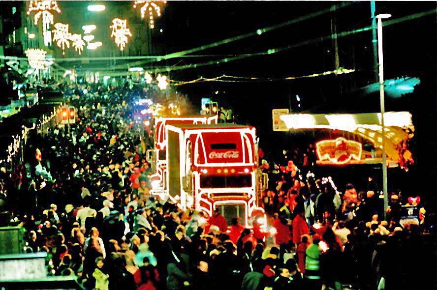 Une parade carnavalesque en plein hiver qui a réuni les chars de différentes sociétés locales mélangés aux camions des pompiers, des bûcherons et des deux superbes semi-remorques illuminés du Père Noël Coca Cola : une foule de plus de 10'000 visiteurs ébahis.