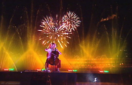 Devant un bassin contenant 30 tonnes d'eau, des effets spéciaux de fontaine lumineuse accompagnés de pyrotechnie.